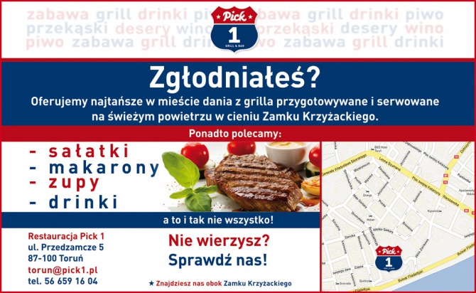 RESTAURACJA PICK 1 ZNAJDUJE SIĘ W MALOWNICZEJ OKOLICY TORUŃSKIEJ STARÓWKI. WYJĄTKOWY WIDOK NA RUINY ZAMKU KRZYŻACKIEGO PRZYCIĄGA DO NAS WIELU TURYSTÓW ORAZ MIESZKAŃCÓW TORUNIA CENIĄCYCH SOBIE CISZĘ ORAZ SPOKÓJ. W NASZEJ RESTAURACJI SKOSZTUJECIE PAŃSTWO SMAKOWITE DANIA Z GRILLA I NIE TYLKO.... PROPONUJEMY RÓWNIEŻ NASZYM KLIENTOM WSPANIAŁE MAKARONY ORAZ SAŁATKI. PRZYJDŹ I PRZEKONAJ SIĘ SAM!!!