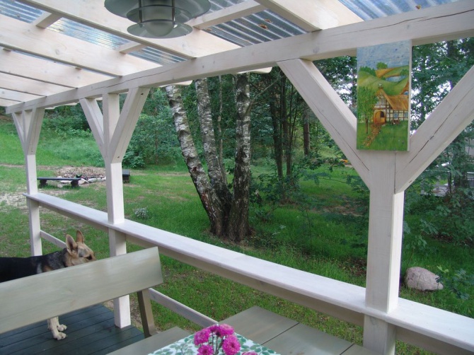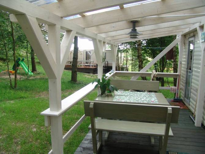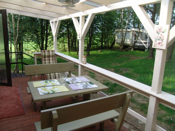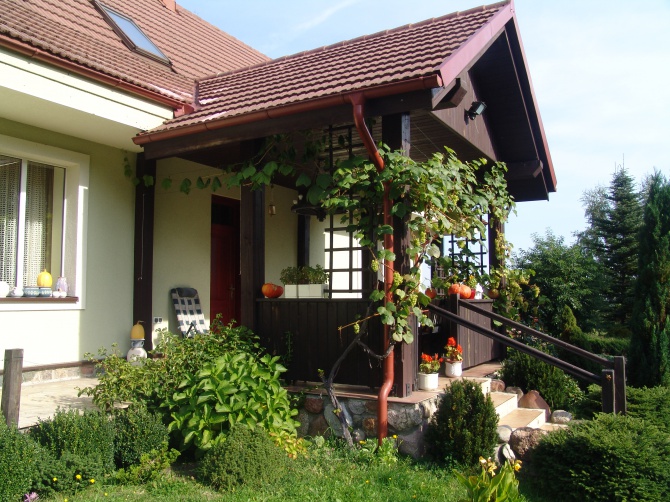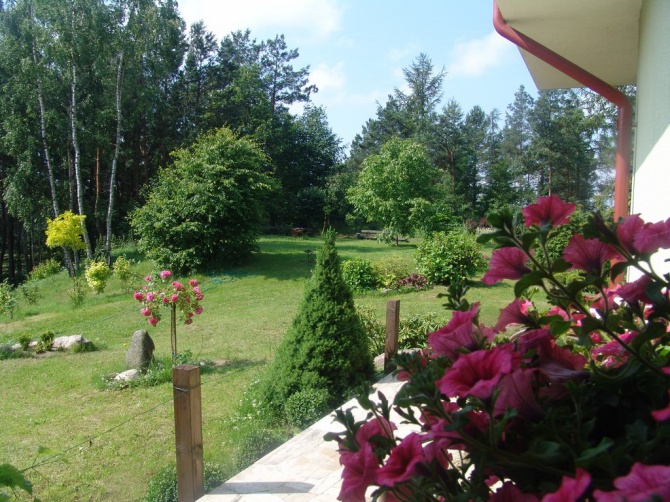 W domu proponuję dwa dwuosobowe pokoje z łazienką, dodatkowo w domku drewnianym mały pokoik z dwuosobowym łóżkiem, z zadaszonym tarasem i letnią kuchnią… Trzy niezależne domki „holenderskie” z zadaszonymi tarasami - pięknie położone w brzozowym lasku, w pełni wyposażone dla 4 do 6 osób, z łazienką i kuchnią. W moim domu salon wspólny z kominkiem, telewizorem i kuchnią, tarasy, ganek, stoły, kanapy na zewnątrz umożliwiające pełny relaks przy domu.