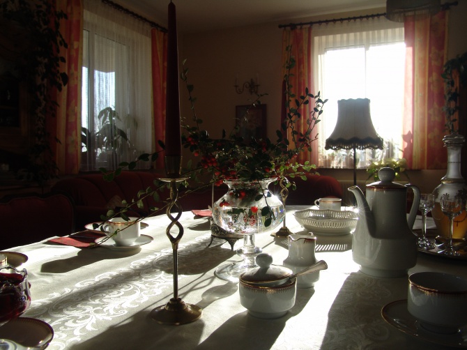 Proponuję domowe posiłki z wykorzystaniem ekologicznych, zdrowych produktów /w tym roku posadziłam 240 krzaków pomidorów/ pyszne urozmaicone śniadania - może być twarożek, sałatka z moich warzyw, z pomidorków, ogórków, cebulki, rukoli i ziół, herbatka z mięty i melisy. Jajeczka są od naszych kur chodzących po dużej, zielonej przestrzeni. Wszystkie tego typu detale do uzgodnienia w zależności od preferencji, mam nadzieję, że możliwe do spełnienia…