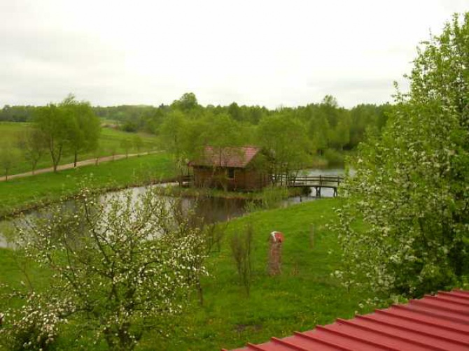 Dodatkowo do wynajmu domek letniskowy (sypialnia, łazienka, salon z aneksem kuchennym, taras wkoło z pomostem - ca.35m² pow. mieszkalnej). Domek znajduje się na wyspie na stawie - tuż koło domu. Staw zarybiony - wszelkiego rodzaju rybą.