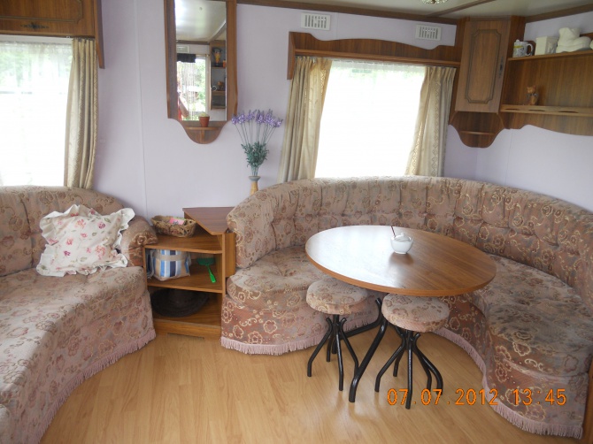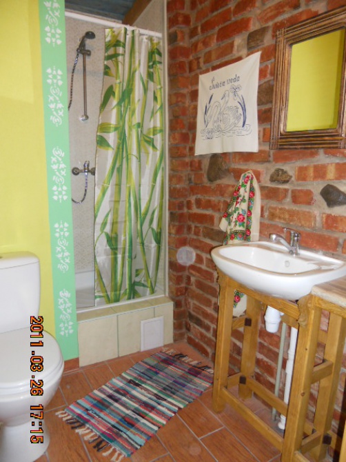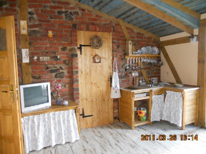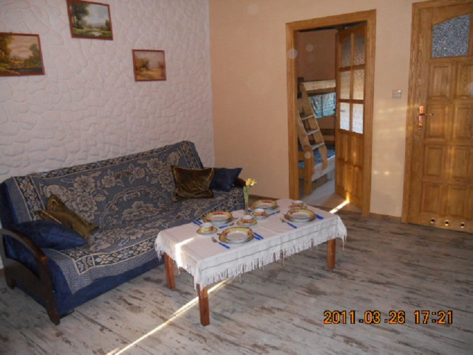 Wnętrze kwatery gościnnej: to salonik (wersalka dla dwóch osób) z aneksem kuchennym (pełne wyposażenie: zlewozmywak, lodówka, płyta ceramiczna, zastawa, sztućce, garnki, patelnie ) sypialnia (łóżko piętrowe: dół dla dwóch osób, góra dla jednej) i łazienka z pełnym węzłem sanitarnym (umywalka, wc, prysznic), ciepła bieżąca woda. Taras przed wejściem do każdej kwatery z kompletem mebli wypoczynkowych. Idealna dla 5 osób - koszt wynajęcia kwatery to 150 zł za dobę.