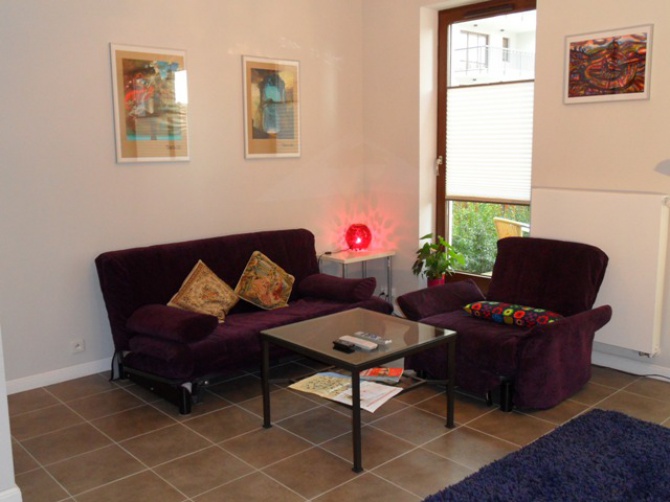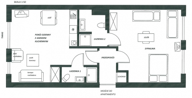 pokój dzienny (od 1 do 3 osób) wyposażony jest w rozkładaną kanapę dwuosobową i rozkładany fotel jednoosobowy.