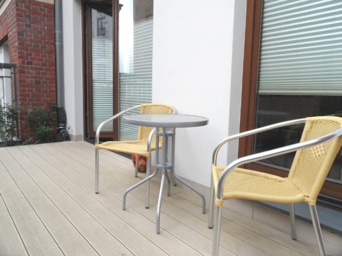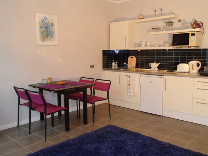 Apartament złożony jest z dwóch przestronnych pokoi (pokoju dziennego i sypialni) oraz przedpokoju. Każdy z pokoi posiada własną łazienkę z kabiną prysznicową. Pokój dzienny (salon) posiada ponadto aneks kuchenny i wyjście na taras. W kuchni dostępne są podstawowe naczynia, sztućce, czajnik, toster, opiekacz, kuchenka indukcyjna i mikrofalowa, lodówka.