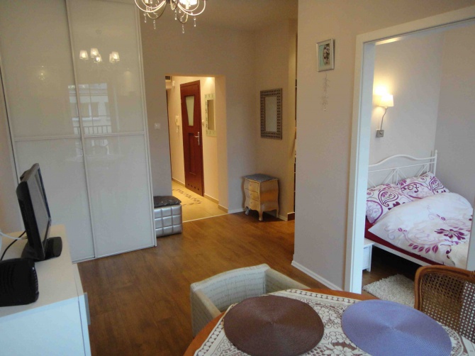 Przebywając w mieszkaniu można zwiedzać Wrocław bez konieczności używania samochodu.Dostępna jest komunikacja miejska we wszystkie części miasta.W apartamencie znajduje się pokój wypoczynkowy wraz z telewizją satelitarnia i internetem Wi-Fi 12 MB, oraz wydzielone niejsce do spania z łózkien 2 -osobowym 140cmx 200 cm oraz łazienka z kabiną i kosmetykami i mały wyposażony aneks kuchenny ,który pozwala na przygotowanie posiłków.