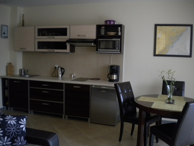 Apartament MARINA posiada salon z aneksem kuchennym wyposażonym w kuchenkę elektryczną, lodówkę, czajnik elektryczny, mikrofalówkę, ekspres do kawy, toster z urządzeniem do gotowania jajek, blender, podgrzewacz do butelek oraz sprzęt kuchenny potrzebny do samodzielnego przygotowywania posiłków dla całej rodziny. W salonie znajduje się rozkładany narożnik, duża komoda, jadalnia wyposażona w stół i 4 wygodne skórzane krzesła oraz sprzęt TV SAT, DVD, CD, konsola Sony PS2. W drugim pokoju znajduje się wygodne łóżko małżeńskie i szafa z półkami. Możliwość dostawki dla 5 osoby. Łazienka wyposażona jest w kabinę prysznicową, toaletę i umywalkę z szafkami, pralkę oraz suszarkę do włosów. Na życzenie dysponujemy również łóżeczkiem dziecięcym 120x60 z materacykiem, fotelikiem do karmienia dzieci i wanienką do kąpieli. W przedpokoju do państwa dyspozycji są dwie duże zabudowane szafy, deska i żelazko do prasowania oraz odkurzacz. Na tarasie do użytku jest również stół, 4 składane krzesła oraz grill.