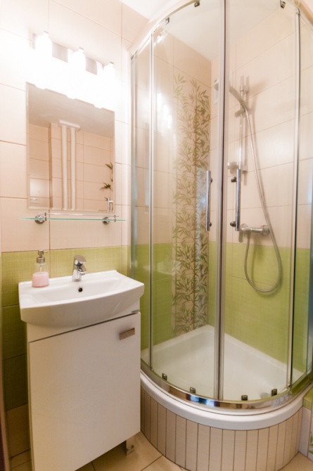 Łazienka: prysznic, umywalka, wc, pralka zabudowana w przedpokoju.