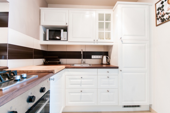 Kuchnia w zabudowie z piekarnikiem, płytą gazową, czajnikiem elektrycznym, mikrofalówką.