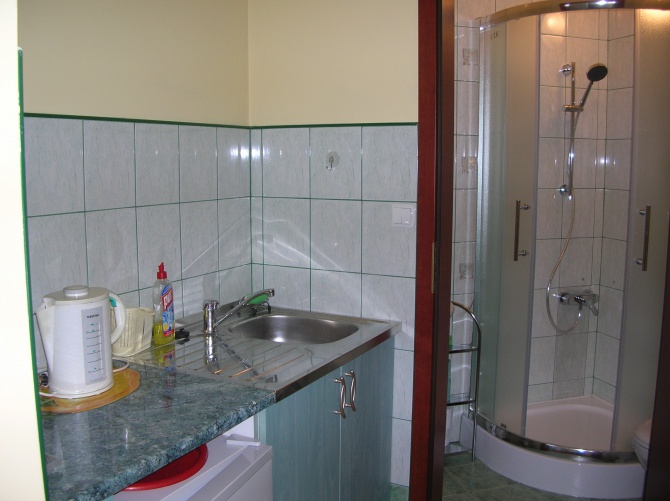Na wyposażeniu jest łazienka z kabiną prysznicową, umywalką i wc, dobrze wyposażony aneks kuchenny z lodówką, kuchenką, czajnikiem elektrycznym, sztućce.