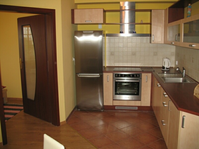 * Aneks kuchenny - lodówka, elektryczna płyta grzewcza, okap, czajnik, stół z czterema krzesłami, komplety naczyń i sztućców oraz przyborów kuchennych,