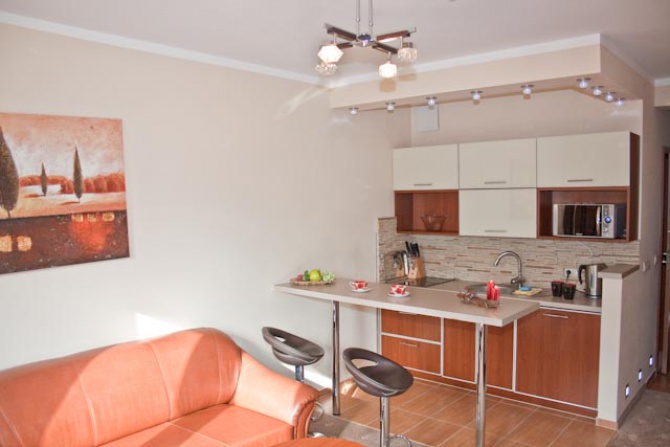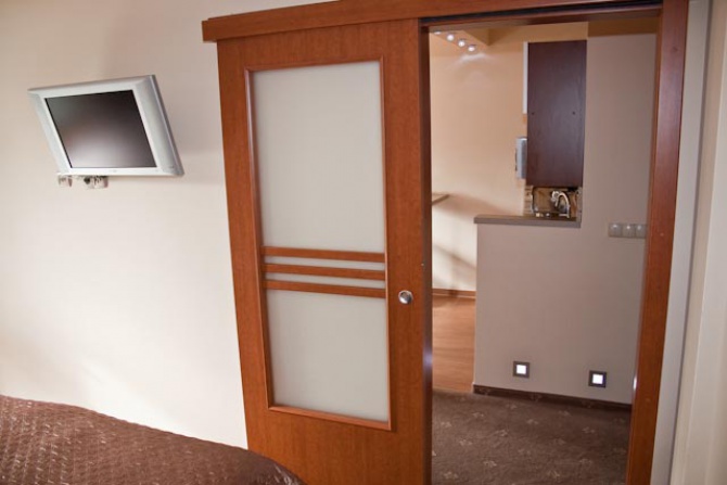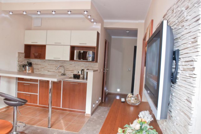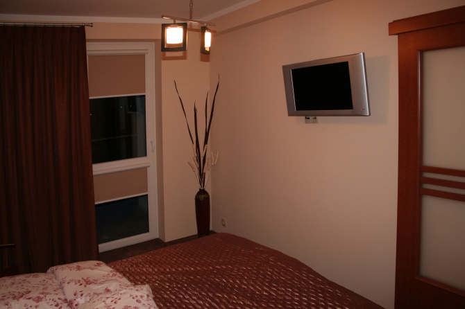 Ponadto ścienny TV LCD (TV SAT ) . Dla wygody gości w apartamencie znajduje się aneks kuchenny: lodówka, czajnik bezprzewodowy,mikrofalöwka,plyta ceramiczna,garnki, filiżanki, talerze oraz sztućce.