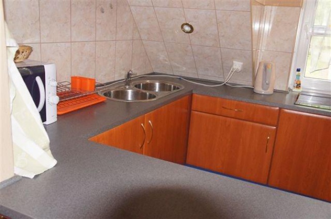 Apartament 3-pokojowy 50 m2 przeznaczony dla 4 do 6 osób, na parterze, praktyczne i wygodne umeblowanie: pokój dzienny – jadalnia z 1 dwuosobową kanapą i TV-sat. 0k. 600 programów w różnych językach, 1 sypialnia z podwójnym łóżkiem – osobne wyjście , 1 sypialnia – 2 łóżka jednoosobowe – osobne wyjście na taras. ,. Kuchnia w pełni wyposażona – kuchenka gazowa dwupalnikowa, kuchenka mikrofalowa, chłodziarko – zamrażarka, czajnik elektryczny, ekspres do kawy . Prysznic/WC. Ogrzewanie elektryczne. Z apartamentu jest bezpośrednie wyjście na duży taras z widokiem na ogród i jezioro, na tarasie meble wypoczynkowe.