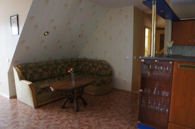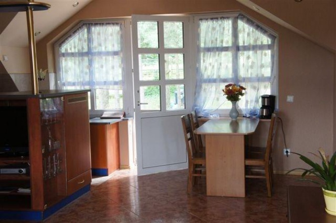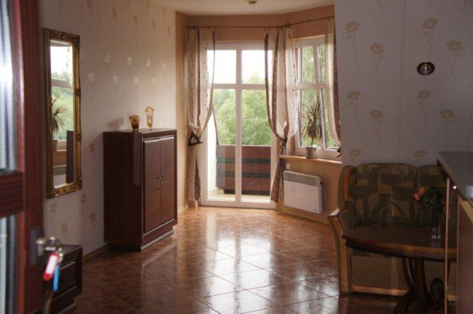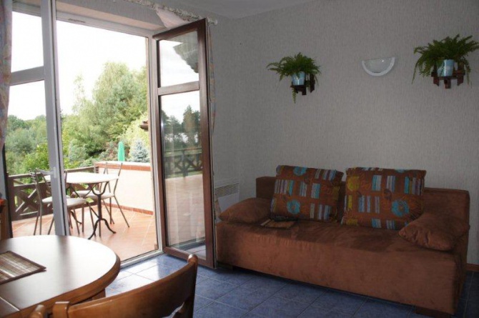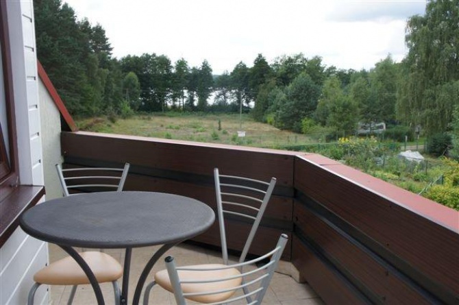 Apartament 4 osobowy – sypialnia z jednym podwójnym łóżkiem + 1 pojedynczym, w salonie kanapa narożna z funkcją spania. Salon połączony z aneksem kuchennym w pełni wyposażonym- kuchenka elektryczna czteropalnikowa, kuchenka mikrofalowa, chłodziarko- zamrażarka, czajnik elektryczny. TV-sat. Możliwość odbioru ok. 600 programów w różnych językach. Łazienka – prysznic, umywalka, wc suszarka do włosów, żelazko. 2 niezależne tarasy – jeden z widokiem na las, jeden z widokiem na ogród i jezioro.