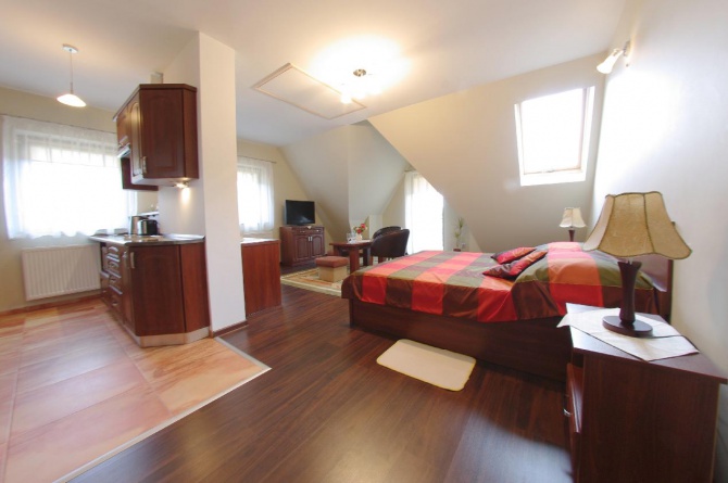3 apartamenty studio składające się z: pokoju dziennego studyjnego o pow: 30m2 (wyposażonego w: aneks kuchenny: płyta ceramiczna, czajnik, opiekacz, naczynia, zastawa, mikrofala, lodówka, tv LCD, komoda, ława, fotele, łoże małżeńskie, nakastliki, szafa, toaletka); antresoli (dwa łóżka, szafki nocne), łazienki (wanna, umywalka, podgrzewana podłoga, wc) oraz przedpokoju (szafa, lustro, wieszak, żelazko)