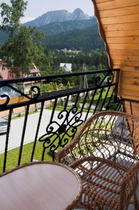 Każdy pokój dzienny posiada balkon z widokiem na panoramę Tatr (Giewont, Czerwone Wierchy).