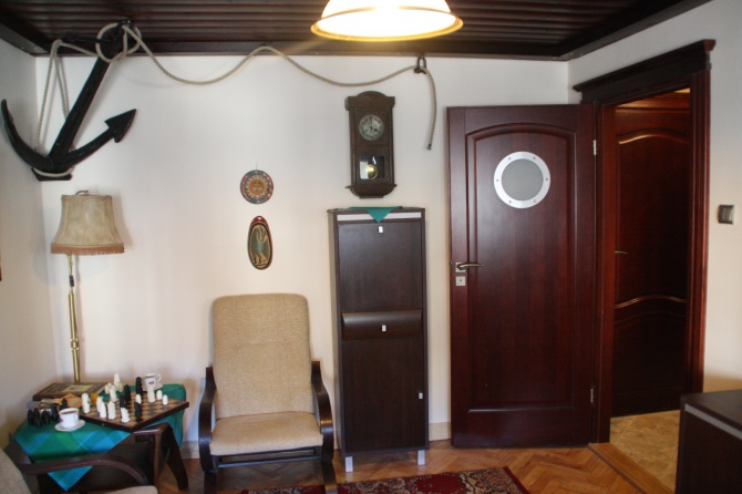 'Kapitańska Kajuta' - samodzielne klimatyczne mieszkanie, w pełni umeblowane i wyposażone w sprzęt RTV i AGD- dobrej klasy. Mieszkanie stylizowane na wnętrze kajuty statku, (min.sufit i ściana z bali drewnianych , )składające sie z pokoju 19m2 przedpokoju łazienki i w pełni wyposażonej kuchni. Bezpośrednie sąsiedztwo sklepów , restauracji . Odległość do morza - 100 kroków..Odległość do mola - 700 kroków.Istnieje możliwość zawarcia umowy na różne okresy czasu.