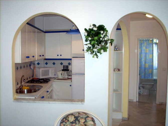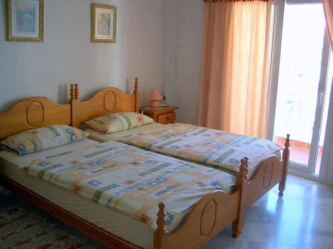 Apartament 2 pokojowy o powierzchni 50 - 60 m2 z 1 sypialnią, ( 2 łóżka 190x 90 ), szafa trzydrzwiowa, sejf (płatny 2,- za dobę) , 2 szafki nocne z lampkami , wyjście na balkon. Pokój mieszkalny wyposażony w stół jadalny z 4 krzesła- mi, rozkładana sofa, lub dostawki dla 3-ej lub 4-tej osoby, stolik przy sofie, oraz inne meble, TV-SAT ( Astra) w tym 4 pr. po Polsku , combi radio, CD, cas. Łącze internetowe w apartamencie 24h ( płatne 4,- Euro / doba , aktywacja min. 1 tydzień) Kuchnia otwarta do salonu , wyposażona w lodówkę z zamrażalnikiem, kuchenkę mikrofalową, maszyna do kawy, toster, piekarnik elektryczny, płyta kuchenna – gazowa i elektryczna, wyciąg oparów, (kompletne wyposażenie stołowe w zastawę na 4 osoby , wyposażenie kuchenne, rondle, garnki , patelnie, noże kuchenne, inne przybory kuchenne itd.). Łazienka z wanna/ prysznic, WC , umywalka , pralka ( płatne 10,- Euro za 1 tydzień, zaplata za cały okres pobytu), suszarka do włosów, suszarka do bielizny Poza tym ,deska do prasowania, żelazko, odkurzacz oraz inny sprzęt do utrzymania czystości. Ogrzewanie wody –bojler elektryczny 60 L. 2 balkony , w tym 1 od strony salonu , z widokiem na morze, ogród , basen i góry, stolik ,krzesła balkonowe, drugi od strony sypialni , również z widokiem na morze i góry ( meble balkonowe na 1 z balkonów).