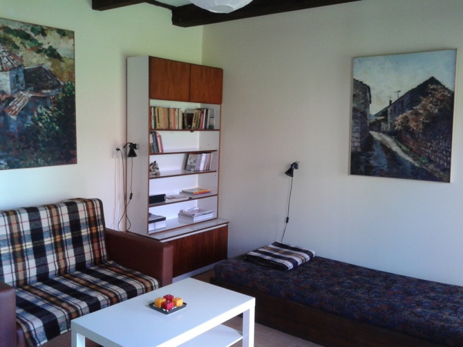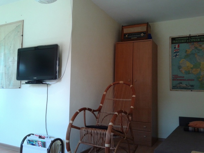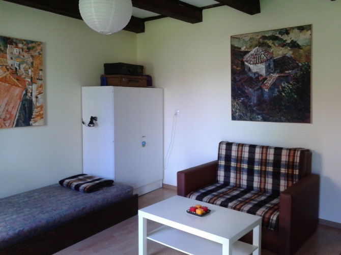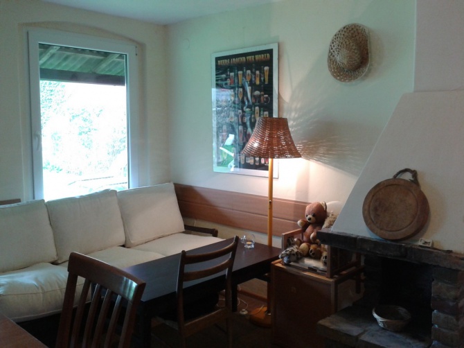 pokój dwuosobowy (dwa tapczaniki) i czteroosobowy (podwójna kanapa i dwa tapczaniki) oba z telewizorem, kuchnia z pełnym wyposażeniem i z otwartym kominkiem, łazienka z prysznicem.