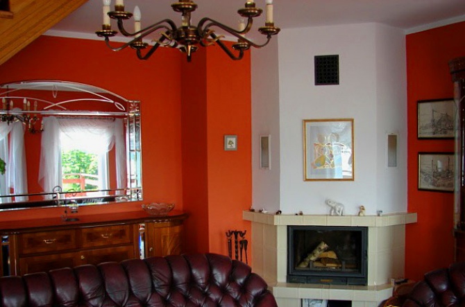 - salon dzienny, z kominkiem i dużym tarasem z widokiem na jezioro