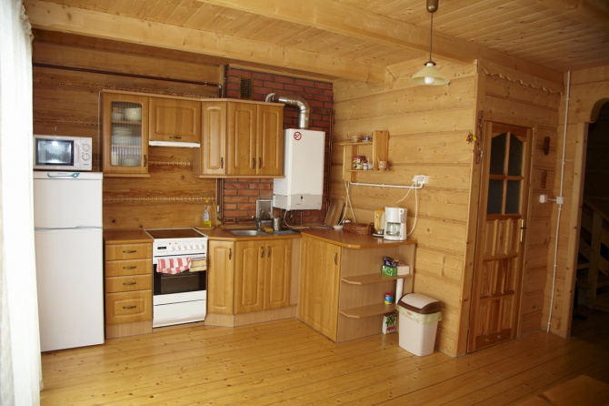 - Przestronna jasna kuchnia wyposażona w sprzęt AGD (kuchenka, piekarnik, lodówka, kuchenka mikrofalowa, pralka) oraz naczynia kuchenne (talerze, garnki, sztućce itd.). W kuchni znajduje się również jadalnia z masywnym drewnianym stołem i ławami.