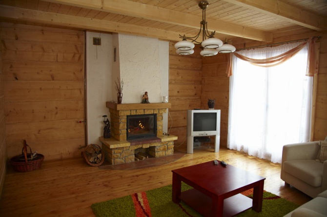 - Na parterze znajduje się komfortowy salon z kominkiem wyposażony w zestaw wypoczynkowy (rozkładana kanapa + dwa fotele) oraz sprzęt RTV, TV-Sat (Cyfra +)