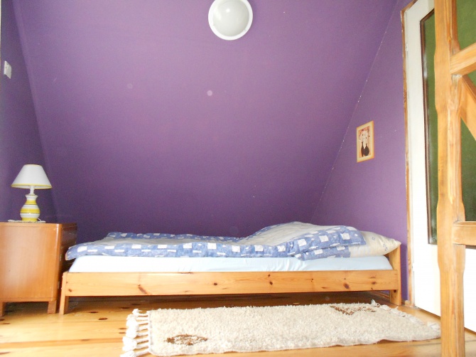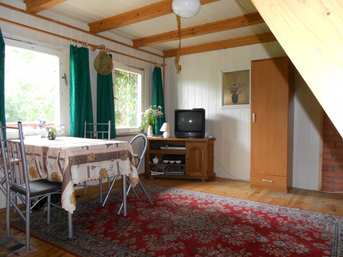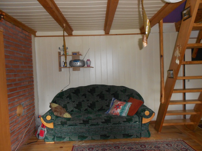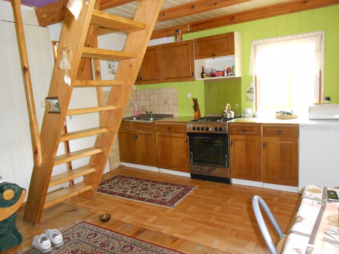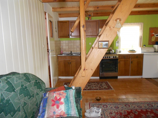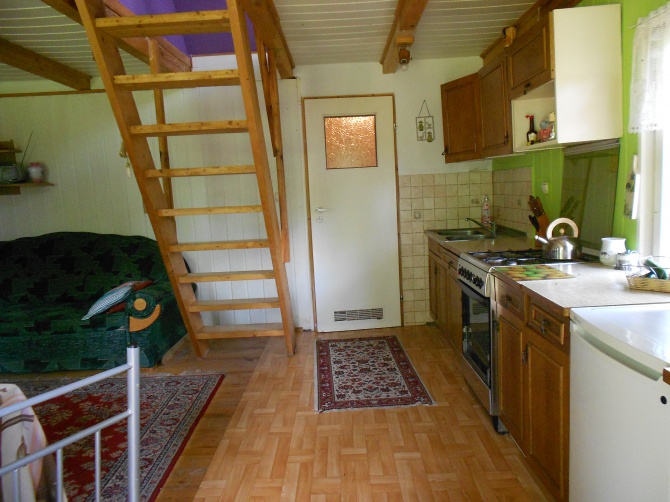 Domek składa się z salonu z aneksem kuchennym oraz łazienką i 2 pokoi na górze oddzielonych ścianką