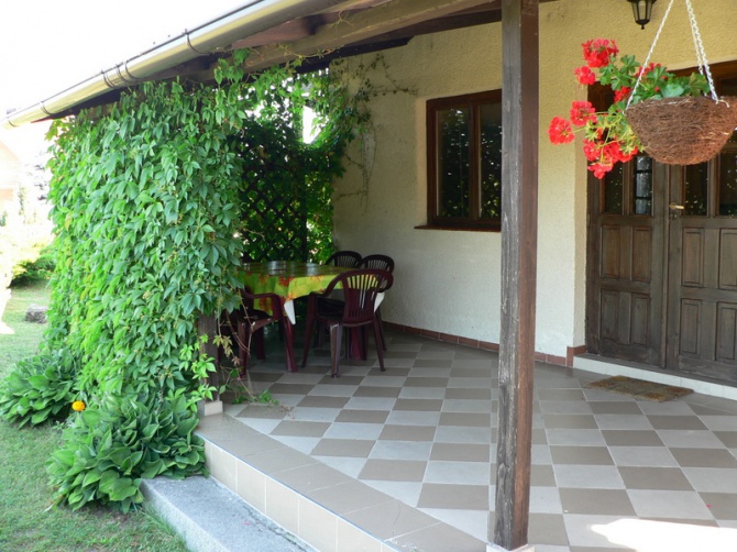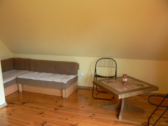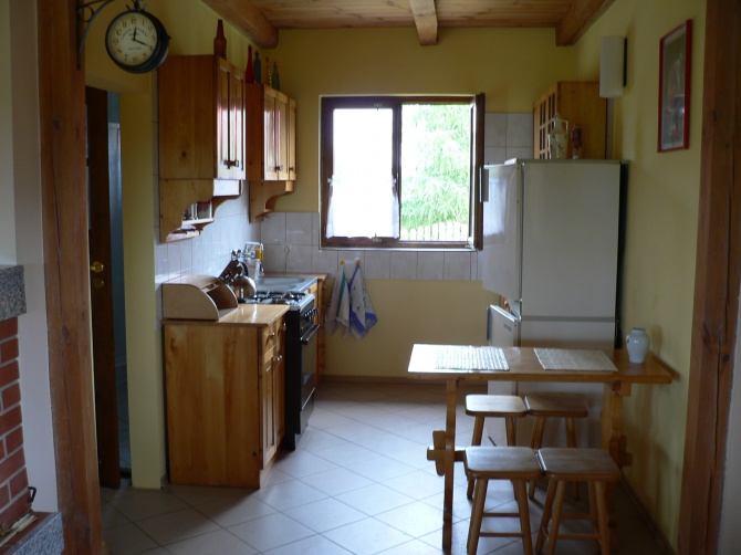 Na parterze znajduje się salon z kominkiem , TV i radiem, kuchnia z pełnym wyposażeniem (kuchnia gazowa, lodówka , zamrażarka , komplet naczyń i zastawy kuchennej), łazienka z natryskiem i WC. Na zewnątrz: duży taras obrośnięty zielenią z meblami ogrodowymi do biesiadowania na świeżym powietrzu.