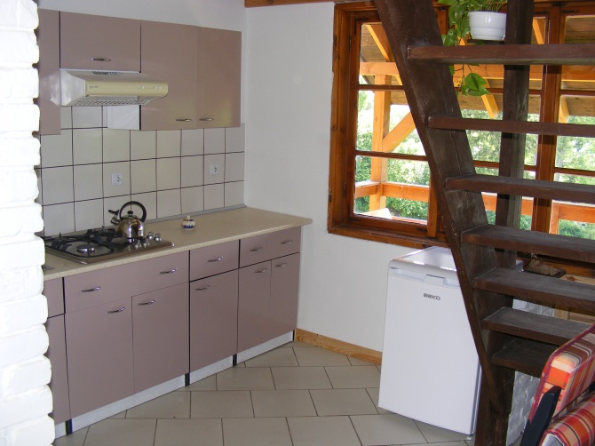 Kompletnie wyposażona kuchnia, łazienka, kominek i aneks wypoczynkowy na parterze.