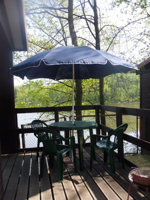 Przed domkiem taras z widokiem na jezioro(stół z parasolem,krzesła)