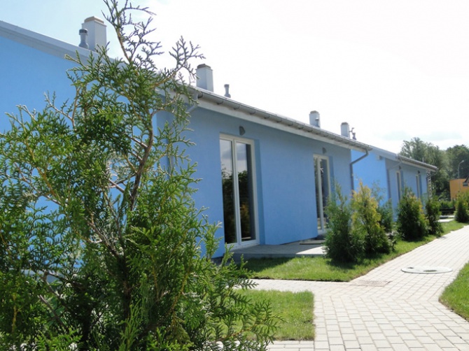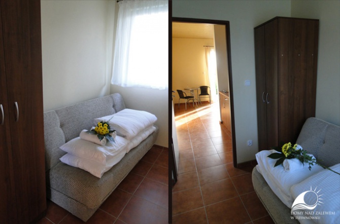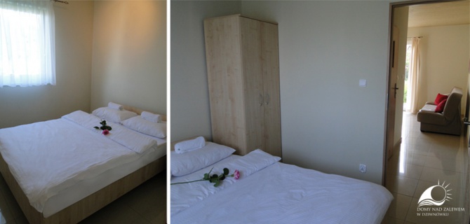W każdym domku 2 pokoje sypialne, aneks kuchenny, łazienka i salon.