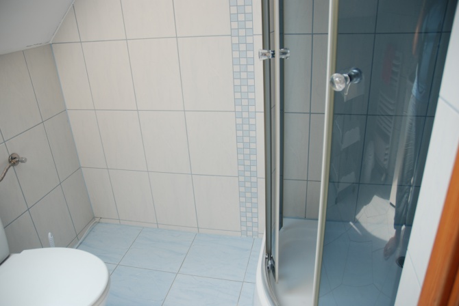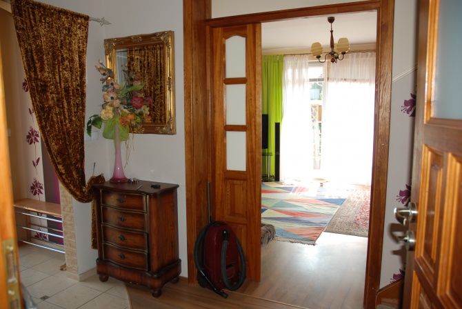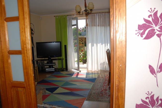 W domu: parter - salon z wyjściem na taras i ogród, kuchnia bdb wyposażona, łazienka z WC, holl; na piętrze: dwie sypialnie /balkon/, łazienka z prysznicem.