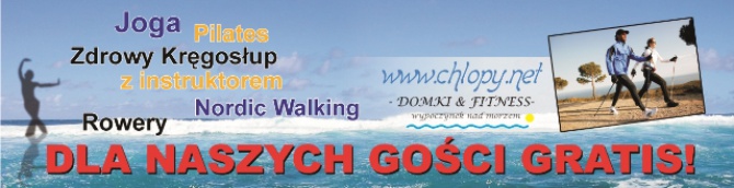 - BEZPŁATNIE DLA NASZYCH GOŚCI-rowery, zajęcia z instruktorem: Nordic Walking, Pilates, Joga, Zdrowy Kręgosłup.
