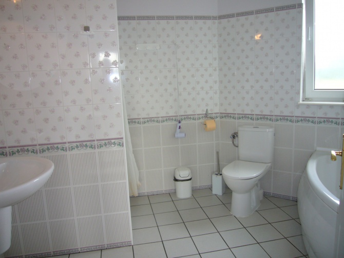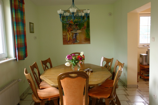 Komfortowy dom caloroczny na max. 8 osob: 6 pokoi, w tym 4 sypialnie, salon z kominkiem i jadalnia, 2 łazienki i kuchnia. Przed domem znajduje sie taras z kominkiem zewnetrznym i meblami ogrodowymi do wypoczynku. Garaż z alarmem + 2 miejsca dodatkowe na parkowanie. Pościel i reczniku sa wliczone w cene wynajmu. Dom jest komfortowo wyposażony w kuchnie elektryczna, zmywarke do naczyń, lodówkę, mikrofalowke, toster, robot kuchenny, televizor, DVD, radio, 2 pralki, suszarka do bielizny, 2 suszarki do wlosow, zelazko, grill.... W sezonie dom jest wynajmowany w odstepach tygodniowych. Na terenie działki znajduje sie plac zabaw ze slizgawka, piaskownica, meble ogrodowe w zacisznych kacikach ogrodu.Sławoszynko sąsiaduje bezpośrednio z miejscowością Karwińskie Błota I, a do najbliższej miejscowości wczasowej Karwi są tylko 3 km. Najbliższy sklep znajduje się w odległości ca. 200 m od domu.