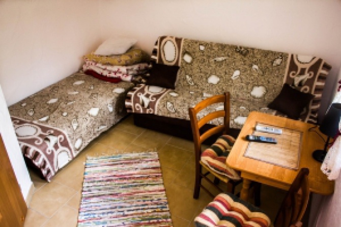 przestronny pokój gościnny położony na II piętrze domu mieszkalnego z odrębnym wejściem, mieszczący od 4-5 osób (wersalka 2-osobowa, kanapa 2-osobowa i tapczanik 1-osobowy), posiadający aneks kuchenny z pełnym wyposażeniem (lodówka, 2-palnikowa kuchenka gazowa, naczynia) , łazienka z kabiną prysznicową i ubikacja.