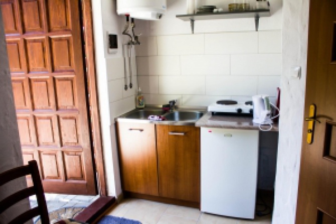 - aneks kuchenny z pełnym wyposażeniem (lodówka, 2-palnikowa kuchenka gazowa, naczynia)