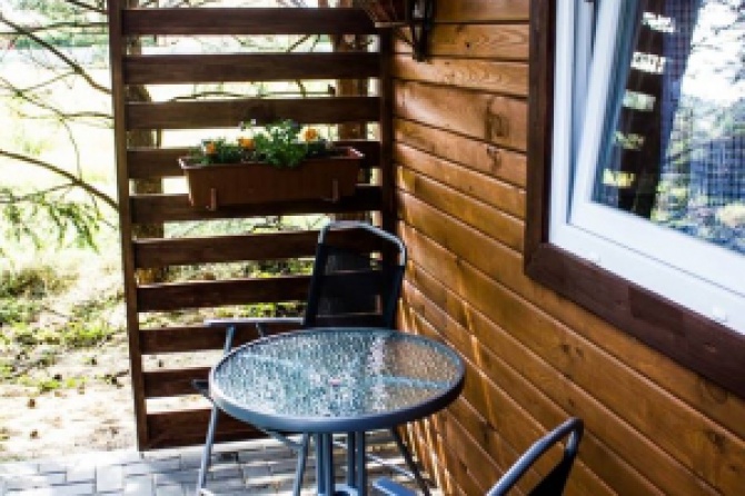 Taras na zewnątrz ze stolikiem i krzesełkami.