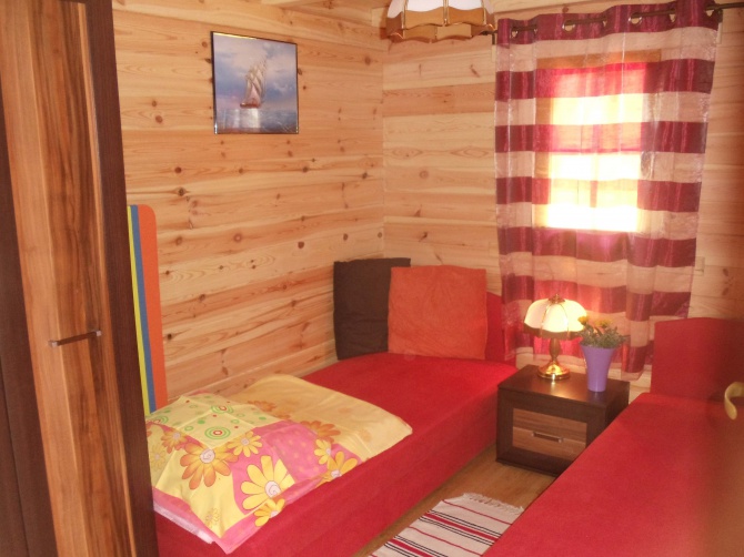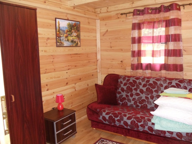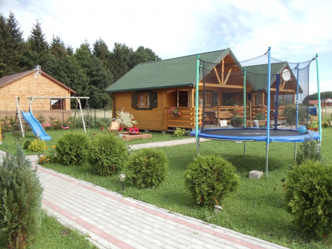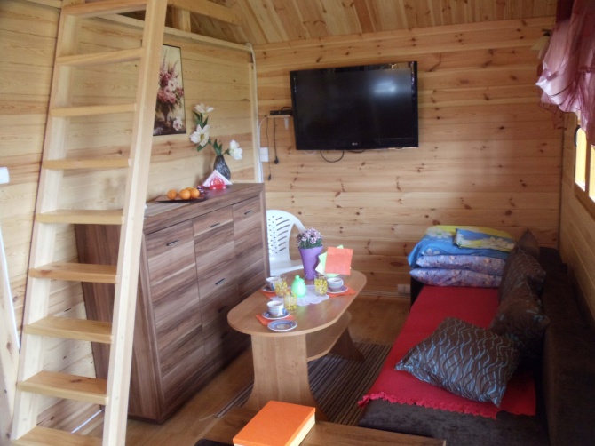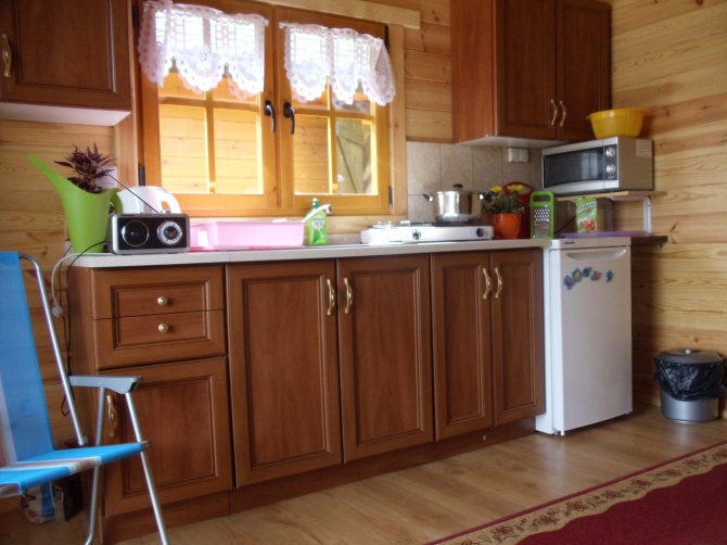 Do Państwa dyspozycji są domki drewniane, przytulne o nietypowym układzie wnętrza. Domy przystosowane są dla rodziny 4-6 osobowej(pobyt dodatkowej osoby po uzgodnieniem z właścicielem). Układ domku to salon z rozkładaną sofą, sypialnia 2 osobowa, aneks kuchenny, łazienka z prysznicem i w-c, antresola do spania 2-3 osobowa oraz duży taras. Kuchnia wyposażona jest w lodówkę, mikrofalę, kuchenkę 2 palnikowa oraz pełen zestaw talerzy i garnków. W skład wyposażenia wchodzi również telewizor LCD, radio oraz meble tarasowe i grill.
