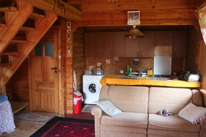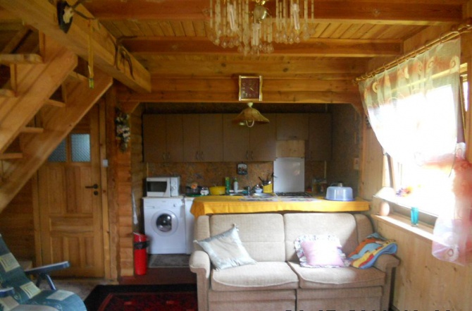 Na parterze domku znajduje się przestronny pokój z jadalnia oraz aneksem kuchennym i łazienką. Kuchnia jest dobrze wyposażona: lodówka, zamrażarka, kuchenka mikrofalowa, 4-palnikowa płyta kuchenna, piekarnik.
