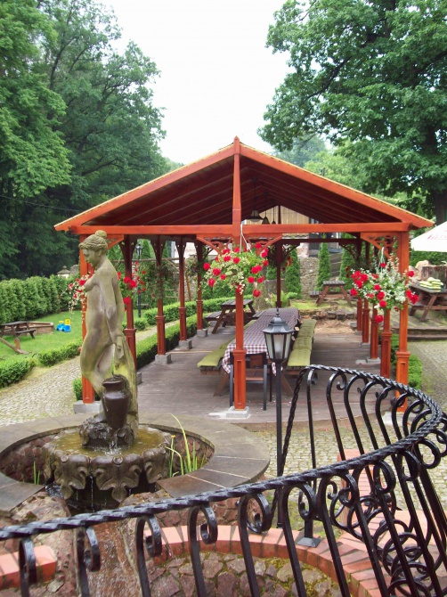 Z restauracji jest wyjście na piękny taras z widokiem na ogród i skarpę. Gości uspokaja ogrodowa fontanna, w której mieszkają złote rybki i zachwycają pięknymi kwiatami lilie wodne.Dla szukających urozmaicenia zapraszamy do tematycznych zatoczek na skarpie, a im wyżej tym piękniejsze widoki.