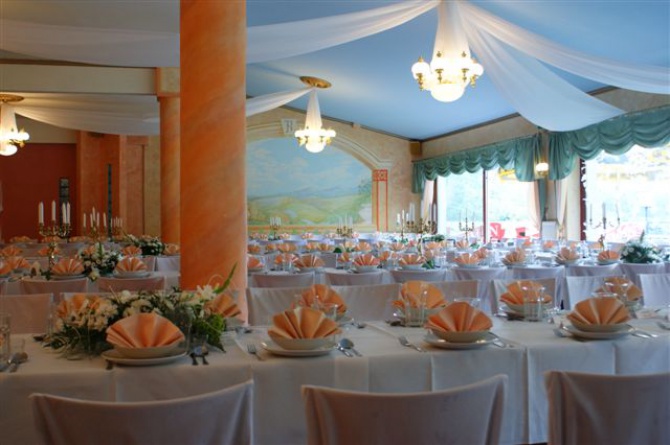 Salę kominkową (ok. 80 m2) z 42’ SatTv oraz cocktail barem, czynnym do ostatniego Gościa, 3 sale konferencyjne (szkoleniowo-dydatktyczne - 108 m2, 90 m2, 60 m2), 200 metrową salę restauracyjną z tarasem widokowym (100 m2), parkiet taneczny z miejscem dla orkiestry + DJ’a - znajdujący się tuż przy sali restauracyjnej (130 m2).