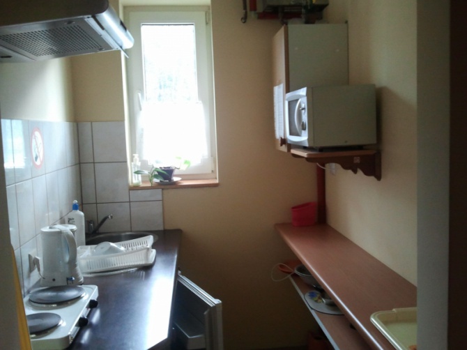 Na korytarzu-jest niewielki aneks kuchenny- gdzie znajduje się zestaw naczyń ,lodówka, mikrofalówka.