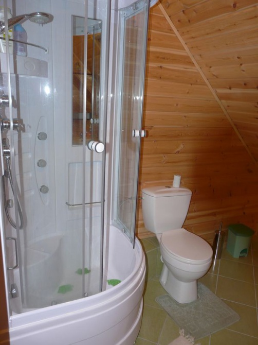 Łazienka: kabina prysznicowa z hydromasażem, umywalka, wc, szafka z lustrem;