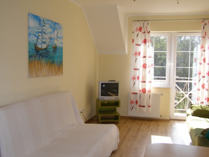 Polecamy Państwu mieszkanie 1 i 2 pokojowe. Jednopokojowe przeznaczone jest max dla 4 osób, mieszkanie 2-pokojowe, dwupoziomowe max dla 6 osób. Każde z mieszkań posiada aneks kuchenny z płytą grzewczą, lodówką, czajnikiem elektrycznym, naczyniami, łazienkę z kabiną natryskową i W-C, TV, balkon. Do dyspozycji gości miejsce parkingowe.