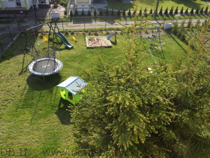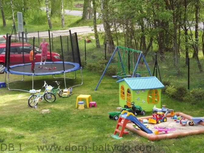 - plac zabaw dla dzieci (trampolina, huśtawki, zjeżdżalnia, piaskownica z zabawkami, domek ogrodowy)