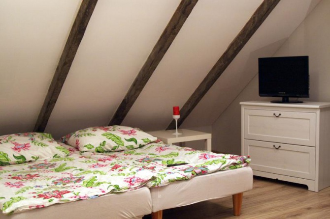 Domek pod Grabami to nowo wybudowany piętrowy budynek. W domku znajduje się 5 pokoi, które łącznie mogą pomieścić 14 osób. Na parterze znajduje się apartament z oddzielnym wejściem wyposażony w aneks kuchenny - lodówka, kuchenka, czajnik, zlew, apartament posiada własną łazienkę, może pomieścić 4 osoby dorosłe. W bryle głównej na parterze mieszczą się dwa pokoje z łazienkami dla 2 lub 3 osób. W holu znajdą Państwo śliczny oceglowany kominek, który umili Państwu wieczory. Do dyspozycji gości jest w pełni wyposażona kuchnia, gdzie znajduje się stół do posiłków, lodówka, czajnik, zlew, kuchenka oraz mikrofalówka. Górna część Domku to dwa pokoje mieszczące od 2 do 3 osób. Skosy i postarzane belki nadają pokojom uroku. Te dwa pokoje dzielą ze sobą łazienkę, która znajduje się na parterze.