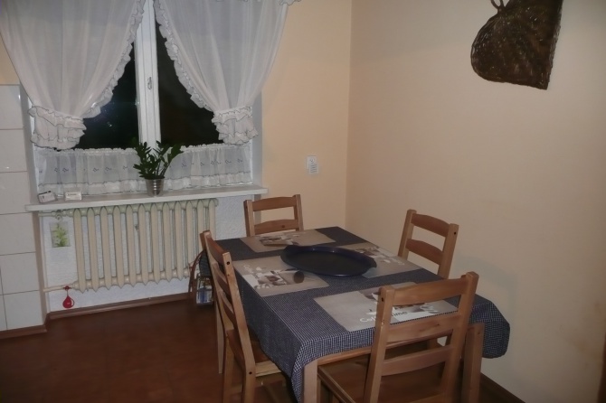 Kuchnia wyposażona w kuchenkę gazową , lodówkę, czajnik elektryczny, expres do kawy,sztućce, naczynia, garnki, itp.