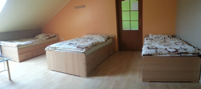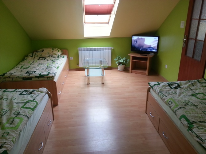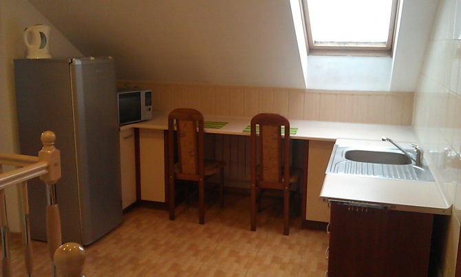 Dom wolnostojący dwupoziomowy o pow. 150 m2, 2 osobne wejścia, 2 łazienki i 2 w pełni wyposażone kuchnie. Dół 7, góra 11 miejsc noclegowych z możliwością dostawienia łóżek.