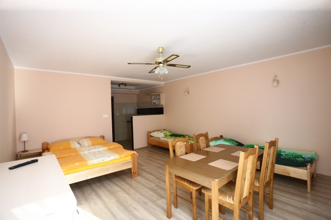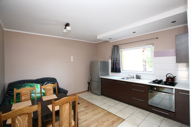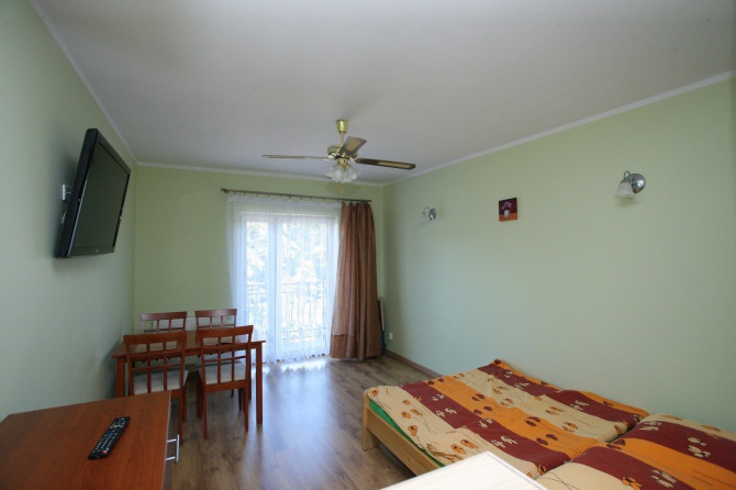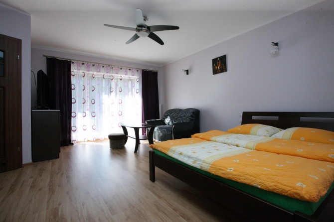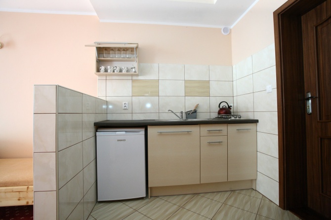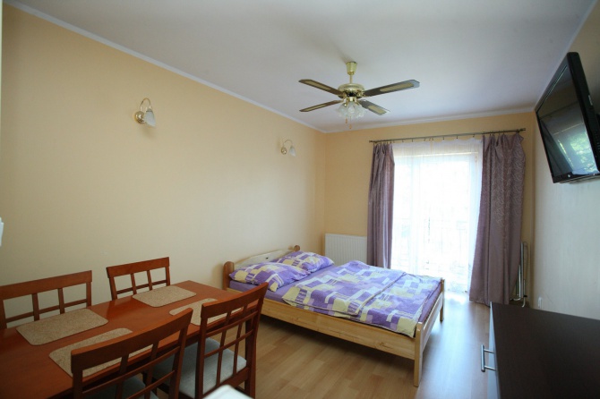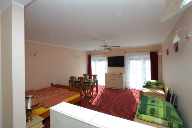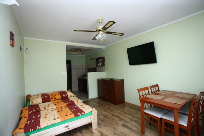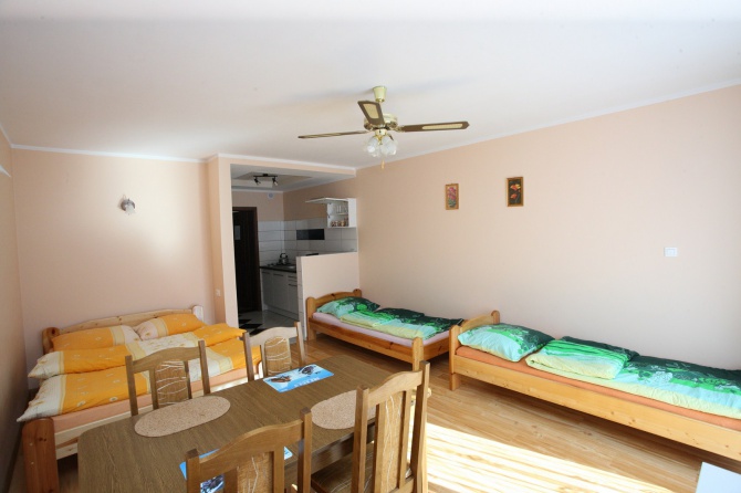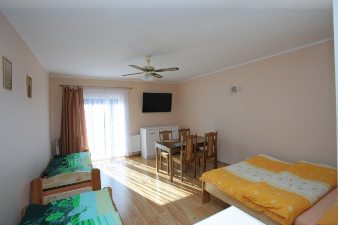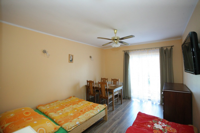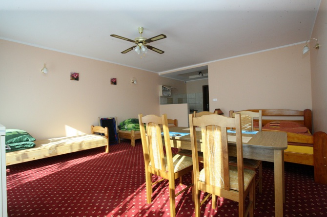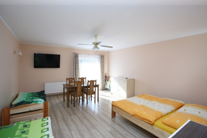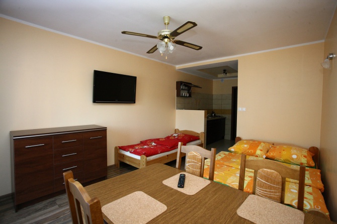 Posiadamy pokoje 2,3,4 osobowe z łazienkami i aneksami kuchennymi z pełnym wyposażeniem. Pokoje wyposażone są w duże wygodne łóżka, stół+krzesła , komodę, szafę , wiszący telewizor od 40 do 46 cali i bezprzewodowy Internet. Ściany pomalowane są farbą antyalergiczną firmy Tikkurila. Każdy pokój posiada przy sufitowy wentylator grawitacyjny. Budynek jest ogrzewany zimą.