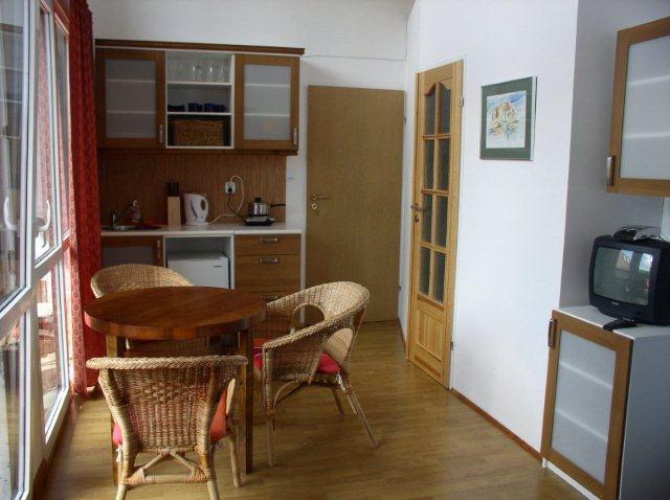 W każdym pokoju jest łazienka, telewizor, radio, lodówka, suszarka oraz czajnik elektryczny. Aneksy kuchenne w apartamentach są wyposażone w komplet niezbędnych naczyń. Dodatkowo przygotowane zostały do zabrania na plażę leżaki i parawany.