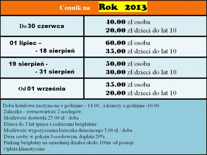 Po uzgodnieniu terminu pobytu oraz ceny należy dokonać wpłaty zaliczki za 2 doby na konto :