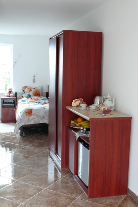 - Szafa -Szafka gastronomiczna : czajnik bezprzewodowy , lodówka , podstawowe naczynia i sztućce